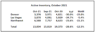 …Inventory almost always declines seasonally in October, so the MoM decline is not a surprise. Last month, these three markets were down 24% YoY, so the YoY decline in October is larger than in September. This isn’t indicating a slowing market (but this is just 3 early reporting markets).