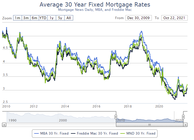 This is a graph from Mortgage News Daily (MND) showing 30 year fixed rates from three sources (MND, MBA, Freddie Mac) since 2010.