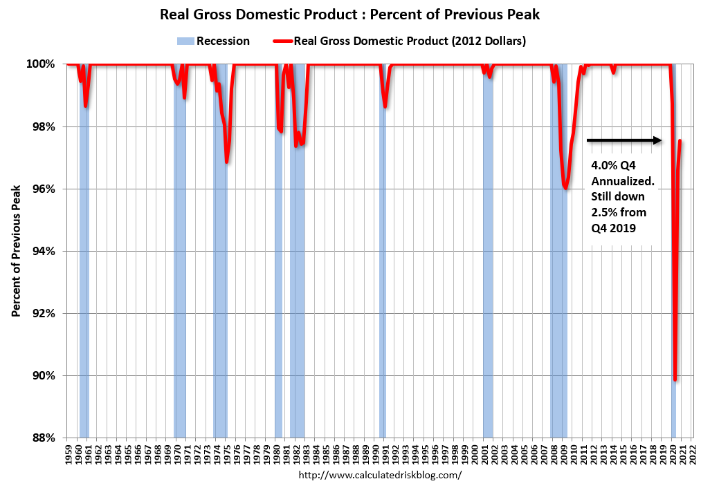 This graph is through Q4 2020, and real GDP is currently off 2.5% from the previous peak.