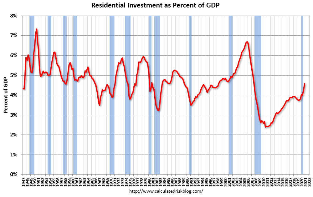 Note: Residential investment (RI) includes new single family structures, multifamily structures, home improvement, broker’s commissions, and a few minor categories.
