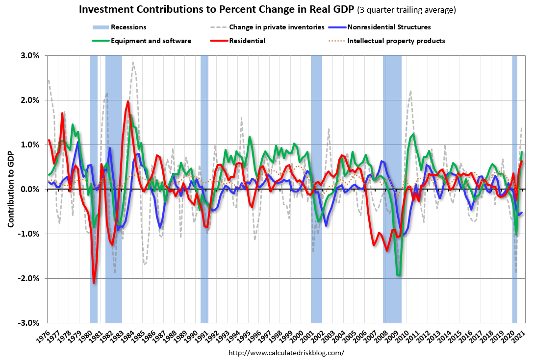In the graph, red is residential, green is equipment and software, and blue is investment in non-residential structures. So the usual pattern – both into and out of recessions is – red, green, blue.