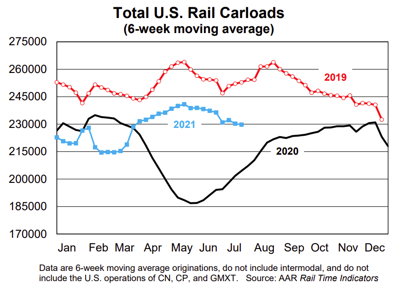 This graph from the Rail Time Indicators report shows the six week average of U.S. Carloads in 2019, 2020 and 2021: