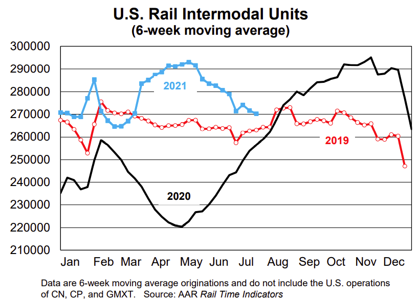 U.S. intermodal originations were up 1.5% in July 2021 over July 2020 but were down 1.9% from July 2019. …