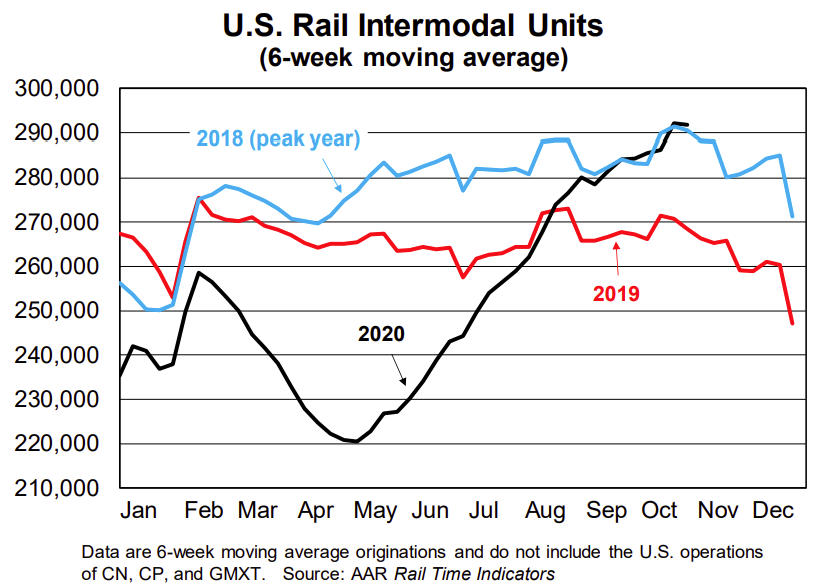 Note that rail traffic was weak prior to the pandemic, and intermodal has come back strong.