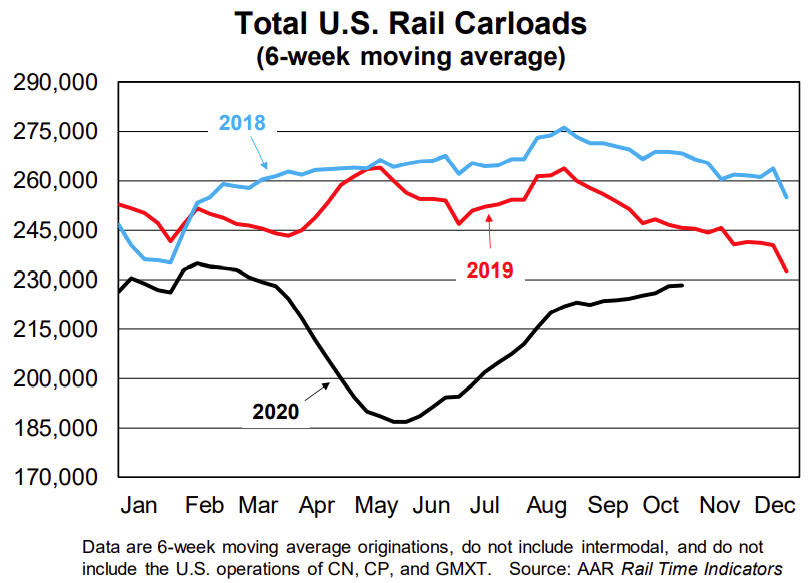 This graph from the Rail Time Indicators report shows the six week average of U.S. Carloads in 2018, 2019 and 2020: