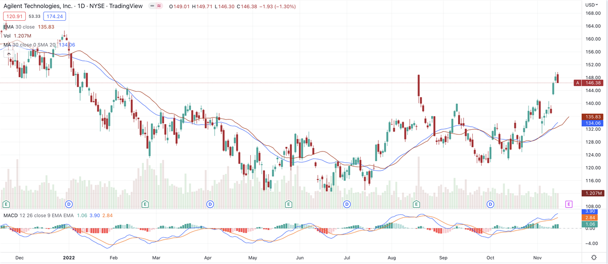 Despite being a large cap, Agilent is slightly more volatile than the broader market, with a beta of 1.09. The chart reveals several gaps, either up or down, in the past several months. That could make the stock difficult to hold on the downside days.