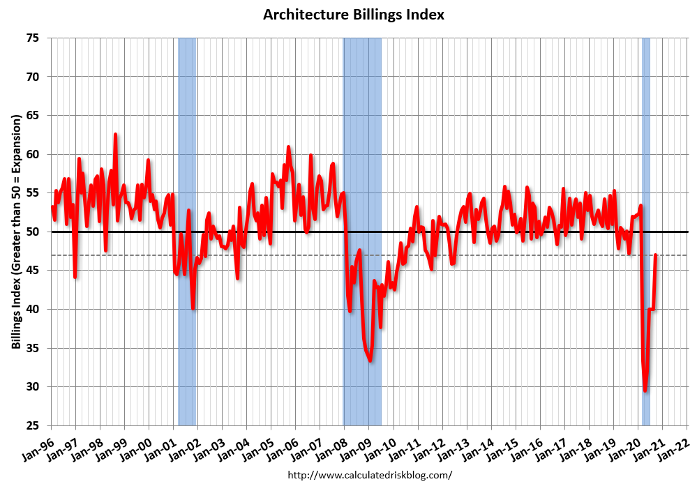 This graph shows the Architecture Billings Index since 1996. The index was at 47.0 in September, up from 40.0 in August. Anything below 50 indicates contraction in demand for architects’ services.