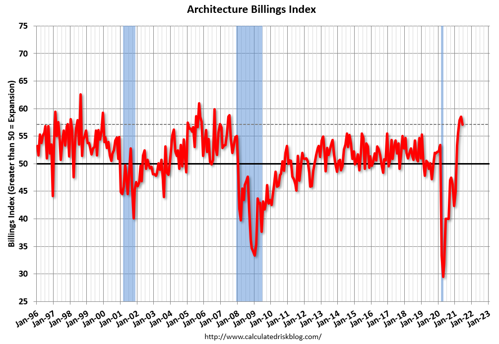 This graph shows the Architecture Billings Index since 1996. The index was at 57.1 in June, down from 58.5 in May. Anything above 50 indicates expansion in demand for architects’ services.