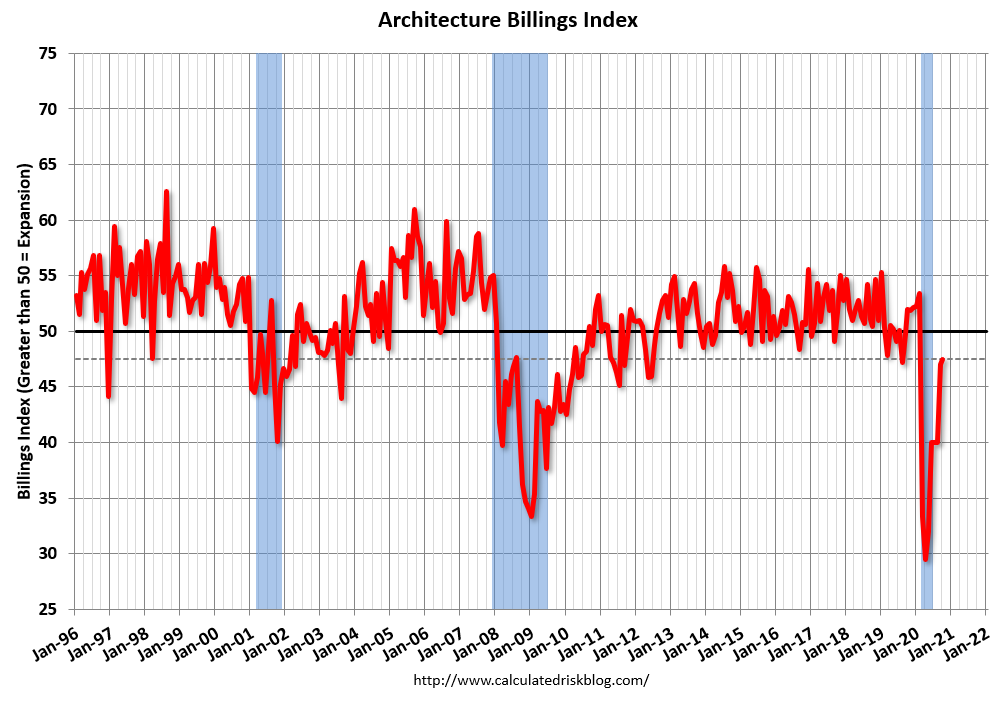 This graph shows the Architecture Billings Index since 1996. The index was at 47.5 in October, up from 47.0 in September. Anything below 50 indicates contraction in demand for architects’ services.