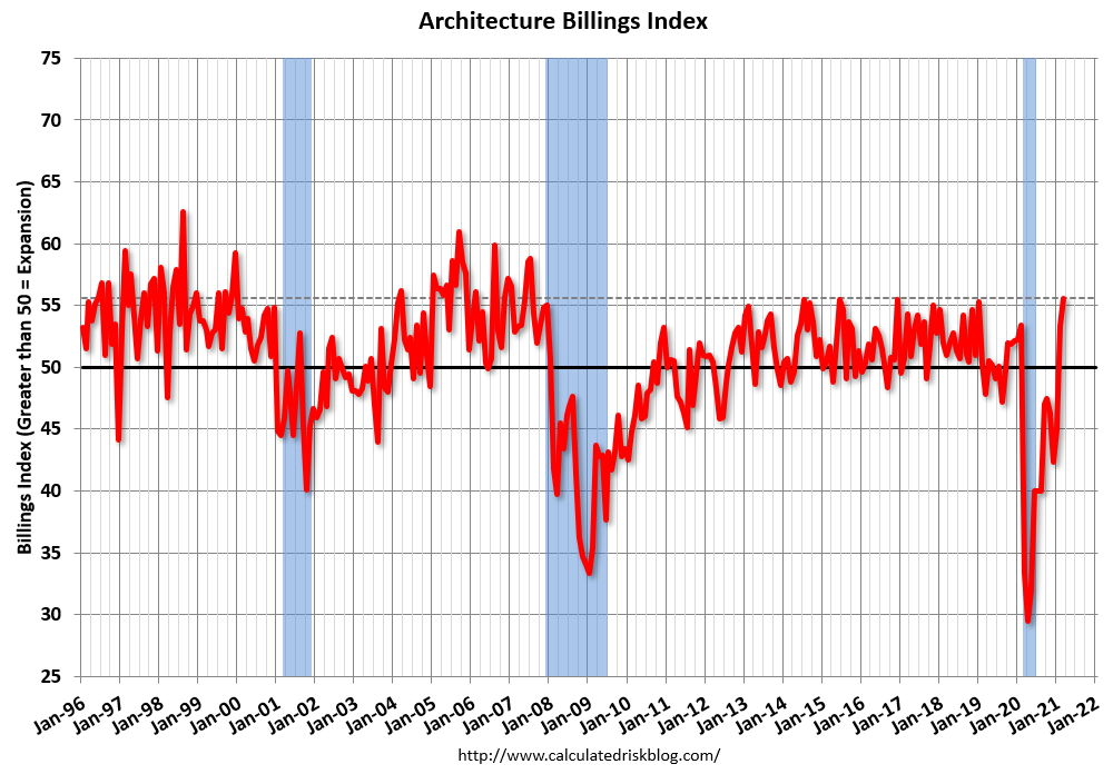 This graph shows the Architecture Billings Index since 1996. The index was at 55.6 in March, up from 53.3 in February. Anything above 50 indicates expansion in demand for architects’ services.