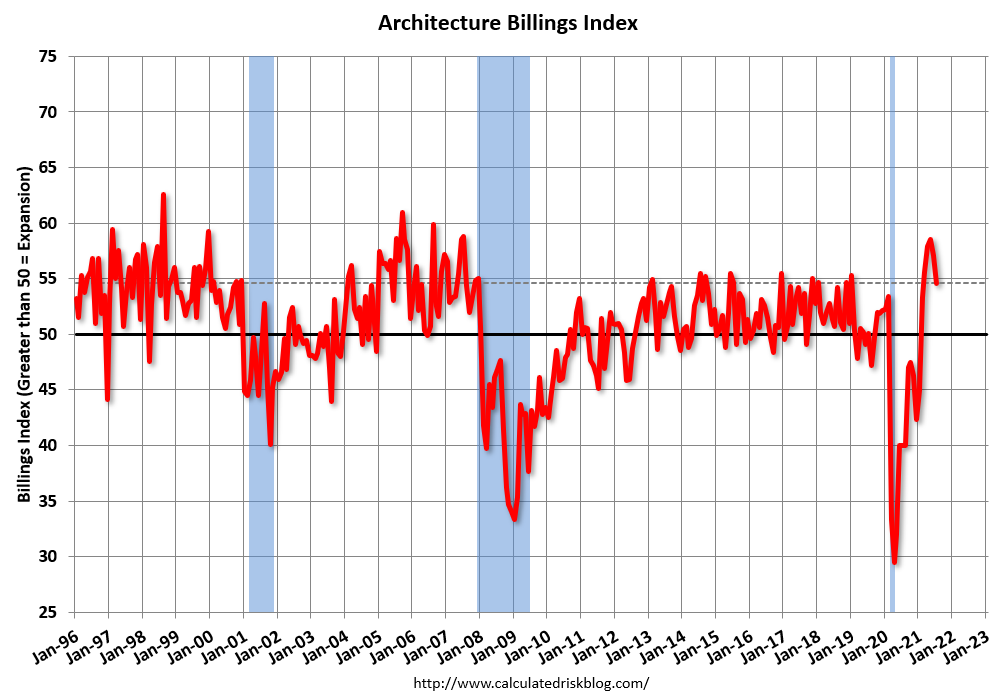 This graph shows the Architecture Billings Index since 1996. The index was at 54.6 in July, down from 57.1 in June. Anything above 50 indicates expansion in demand for architects’ services.