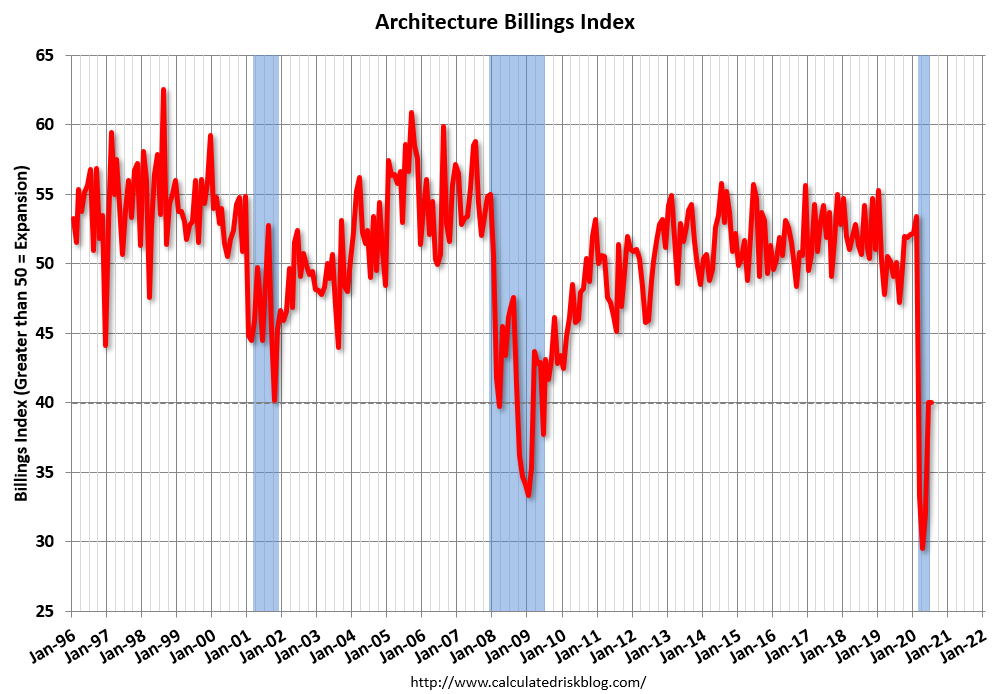 This graph shows the Architecture Billings Index since 1996. The index was at 40.0 in July, unchanged from 40.0 in June.. Anything below 50 indicates contraction in demand for architects’ services.