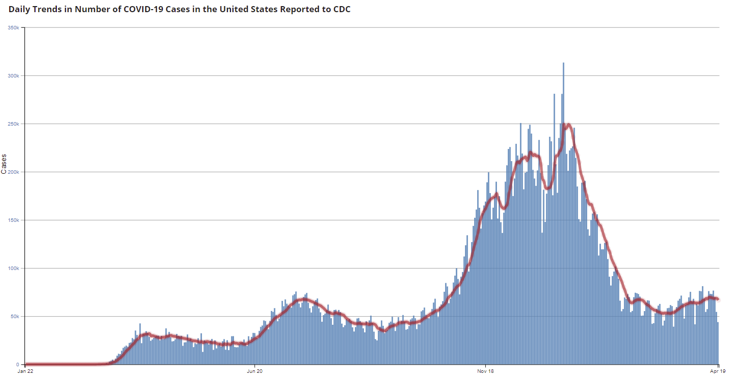 The 7-day average is 66,687, down from 68,602 yesterday, and close to the summer surge peak of 67,337 on July 23, 2020.