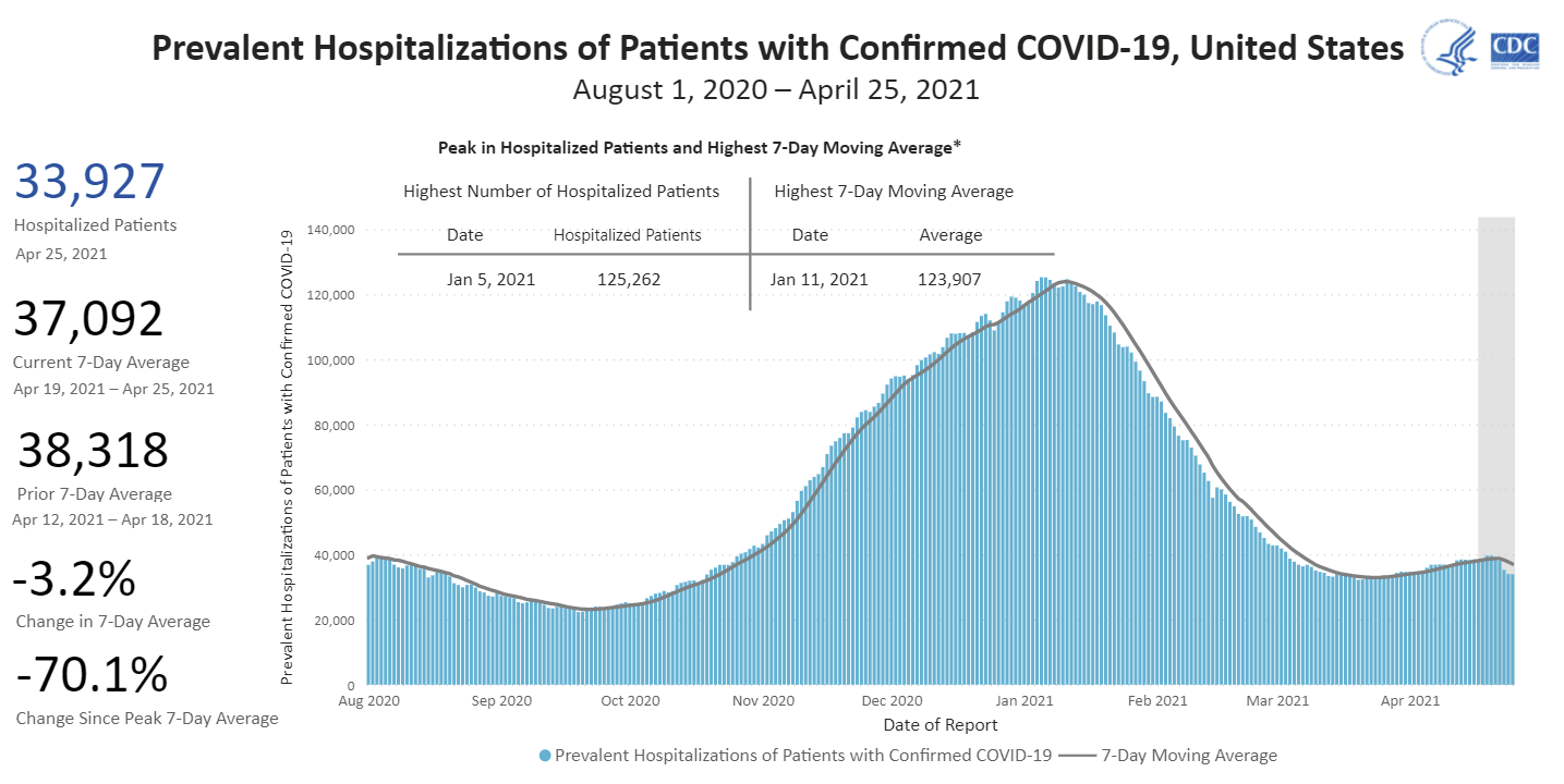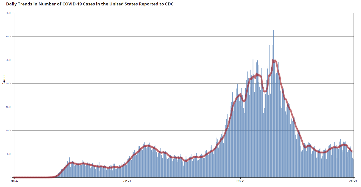 The 7-day average is 55,186, down from 56,013 yesterday, and down from the recent peak of 69,878 on April 13, 2021. This is also below the summer surge peak of 67,337 on July 23, 2020.