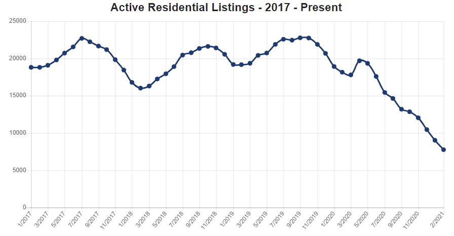 Active Residential Listings in February 2021 were 7,767, down 57.2% from 18,163 in February 2020.