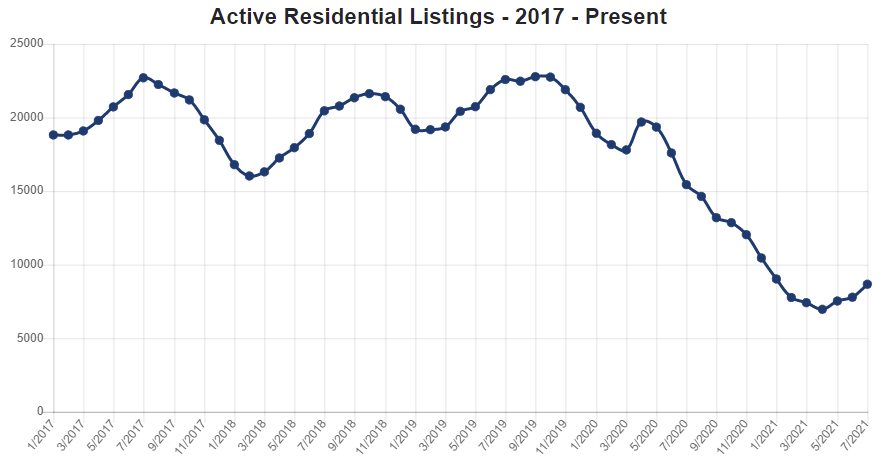 Active Residential Listings in July 2021 were 8,668, down 43.9% from 15,442 in July 2020.