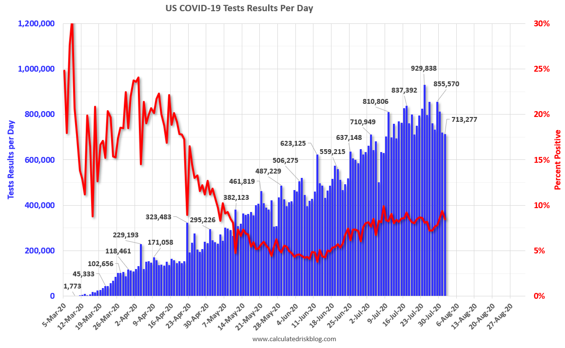 The US is now reporting over 700,000 tests per day. Based on the experience of other countries, the percent positive needs to be well under 5% to really push down new infections, so the US still needs to increase the number of tests per day significantly (or take actions to push down the number of new infections).