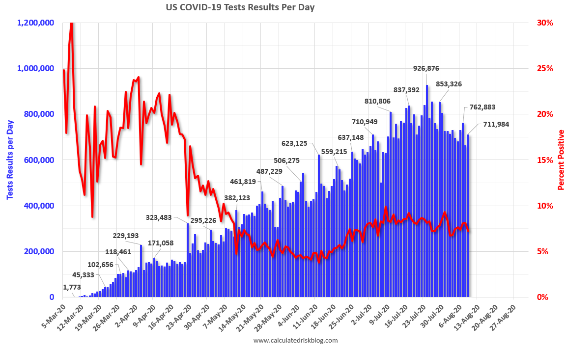 The US is now mostly reporting over 700,000 tests per day. Based on the experience of other countries, the percent positive needs to be well under 5% to really push down new infections, so the US still needs to increase the number of tests per day significantly (or take actions to push down the number of new infections).
