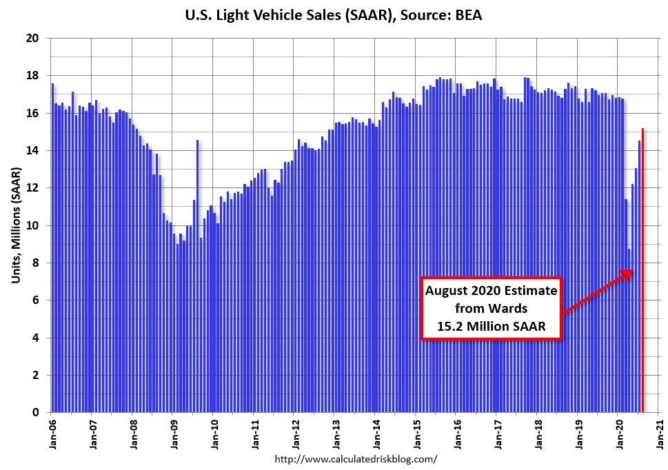 The Wards forecast of 15.2 million SAAR, would be up 4.7% from July, and down 11% from August 2019.