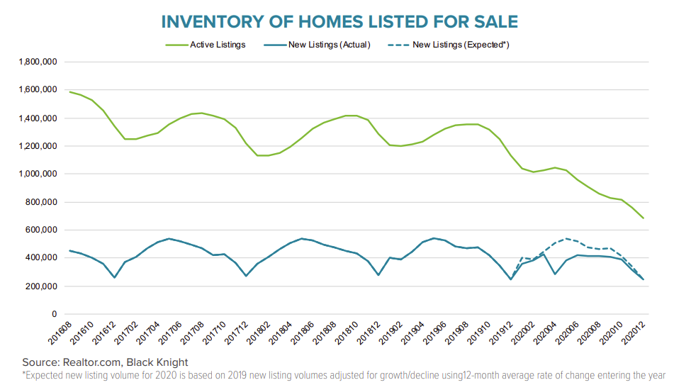 • Even factoring in a slight downward trend in new listings in recent years, volumes for 2020 suggest that more than 750K homeowners chose to forego listing their homes for sale in 2020 because of the pandemic (a 16% decline year-over-year)