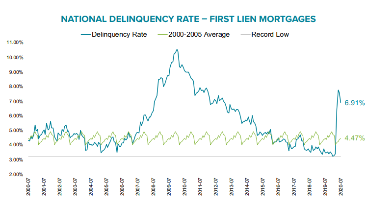 • Overall mortgage delinquencies fell by nearly 9% in July, pushing the national delinquency rate down to 6.9%