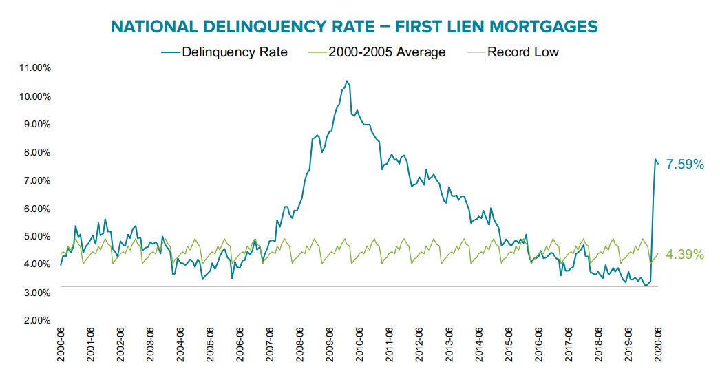 • Nearly 7.6% of mortgage holders remain delinquent, up from a record low 3.2% at the beginning of the year