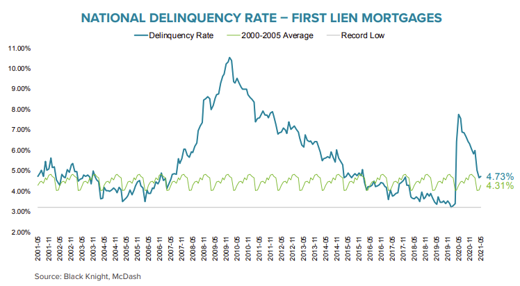 • May’s mortgage delinquency increase is only the second since the pandemic recovery began last June and – like the first – appears to be calendar related and likely temporary