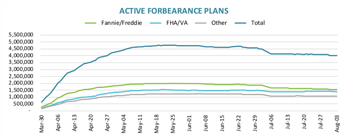 The latest data from the McDash Flash Forbearance Tracker shows that, improving upon last week’s decline, the number of active forbearance plans fell by 101,000 from the week prior, driven in part by the estimated 500,000 plans that were set to expire at the end of July entering the last week of the month.