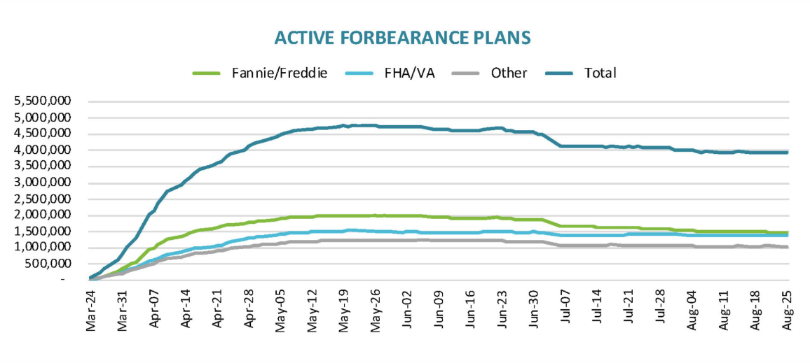 According to Black Knight’s McDash Flash Forbearance Tracker, as of August 25, 3.9 million homeowners remain in active forbearance, representing 7.4% of all active mortgages. This is unchanged from last week (or the week prior). Together, they represent $828 billion in unpaid principal. Of these, 72% have had their terms extended.