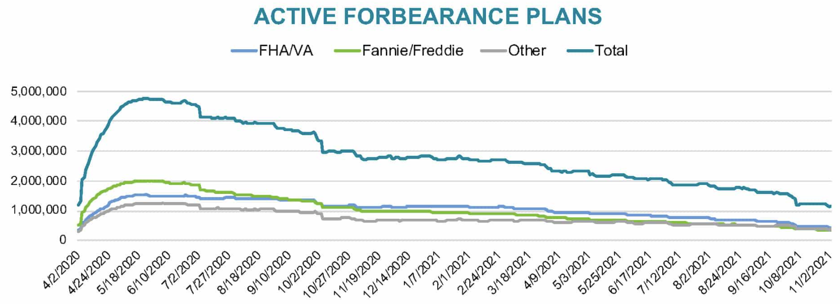 As of Nov. 2, 1.14 million mortgage holders remain in COVID-19 related forbearance plans, representing 2.1% of all active mortgages, including 1.2% of GSE, 3.5% FHA/VA and 2.8% of portfolio/PLS loans.