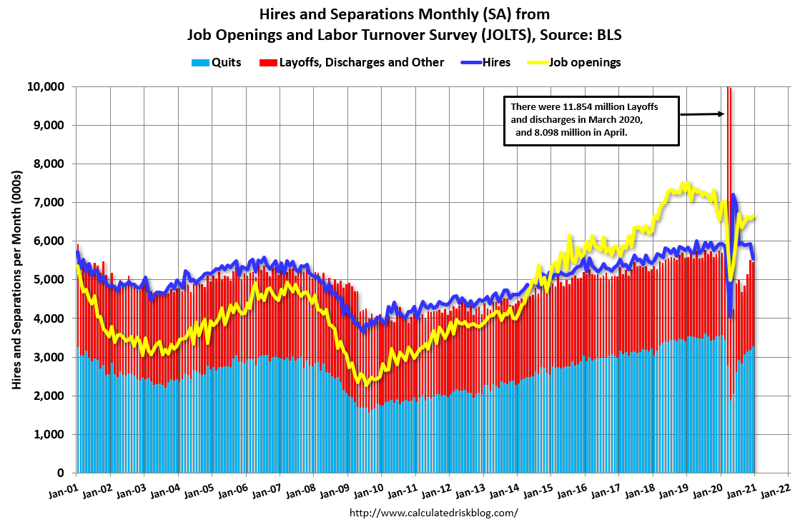 The following graph shows job openings (yellow line), hires (dark blue), Layoff, Discharges and other (red column), and Quits (light blue column) from the JOLTS.