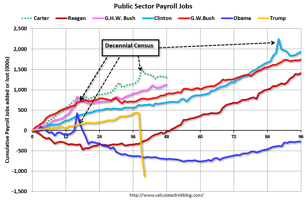A big difference between the presidencies has been public sector employment. Note: the bumps in public sector employment due to the decennial Census in 1980, 1990, 2000, and 2010.