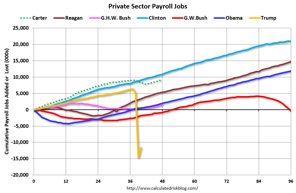 During the first 40 months of Mr. Trump’s term, the economy has lost 11,593,000 private sector jobs.