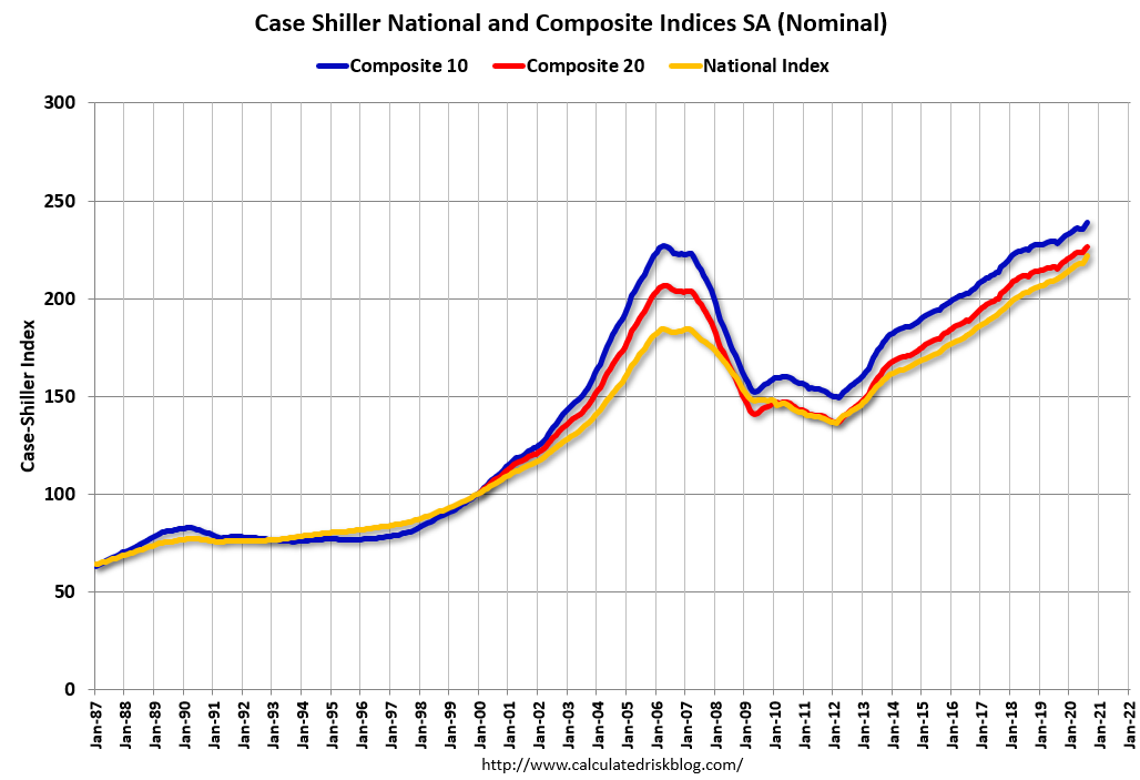 The first graph shows the nominal seasonally adjusted Composite 10, Composite 20 and National indices (the Composite 20 was started in January 2000).