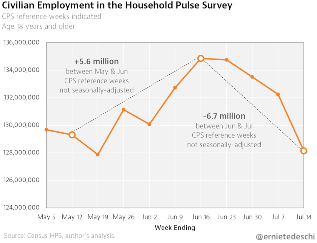 That’s a cumulative loss of -6.7 million jobs between the reference weeks used for the June & July monthly jobs report.
