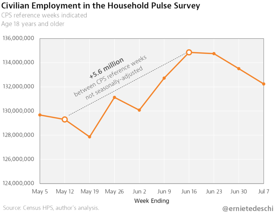 Employment in the @uscensusbureau Household Pulse Survey fell another -1.3 million last week alone. It’s now fallen -2.6 million cumulatively over the past 3 weeks.