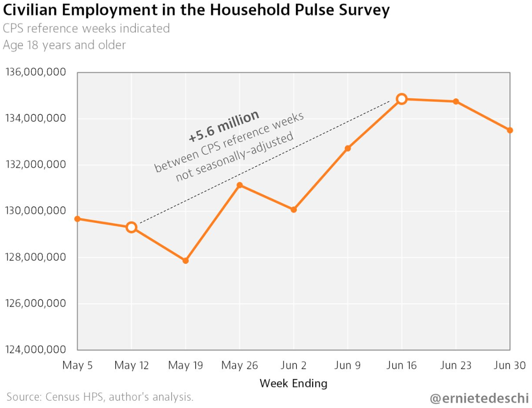 The @uscensusbureau Household Pulse Survey, which performed admirably in anticipating the June jobs report, now shows employment has fallen by about 1.3 million cumulatively over the last 2 weeks.