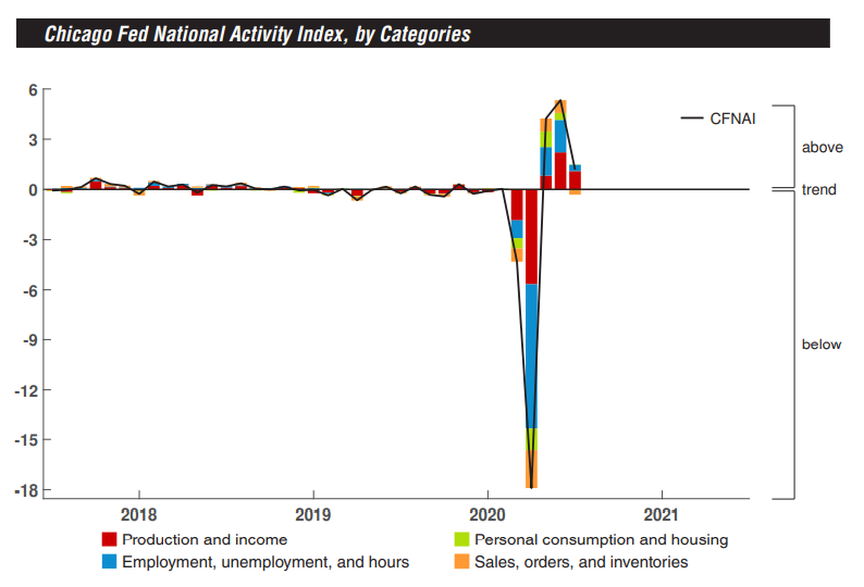 Led by some moderation in the growth of production- and employment-related indicators, the Chicago Fed National Activity Index (CFNAI) declined to +1.18 in July from +5.33 in June. Three of the four broad categories of indicators used to construct the index made positive contributions in July, but all four categories decreased from June. The index’s three-month moving average, CFNAI-MA3, rose to +3.59 in July from –2.78 in June.