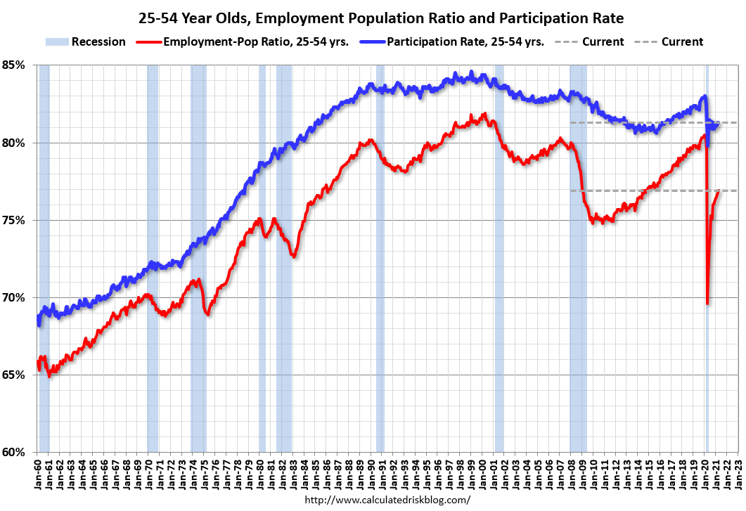 Employment Population Ratio, 25 to 54Since the overall participation rate has declined due to cyclical (recession) and demographic (aging population, younger people staying in school) reasons, here is the employment-population ratio for the key working age group: 25 to 54 years old.