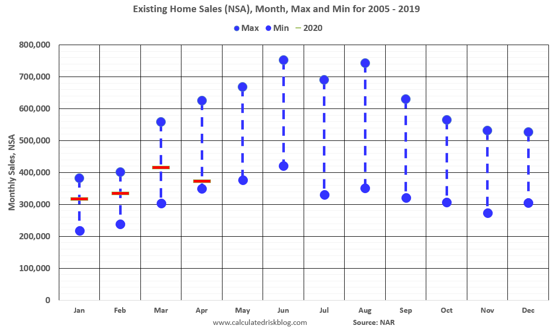 The second graph shows existing home sales Not Seasonally Adjusted (NSA) by month (Red dashes are 2020), and the minimum and maximum for 2005 through 2019.