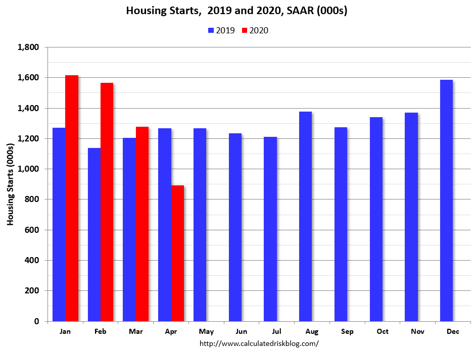 The housing starts report showed starts were down 30.2% in April compared to March, and starts were down 29.7% year-over-year compared to April 2019.