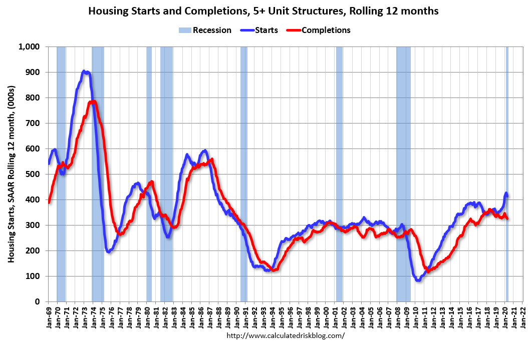 The blue line is for multifamily starts and the red line is for multifamily completions.