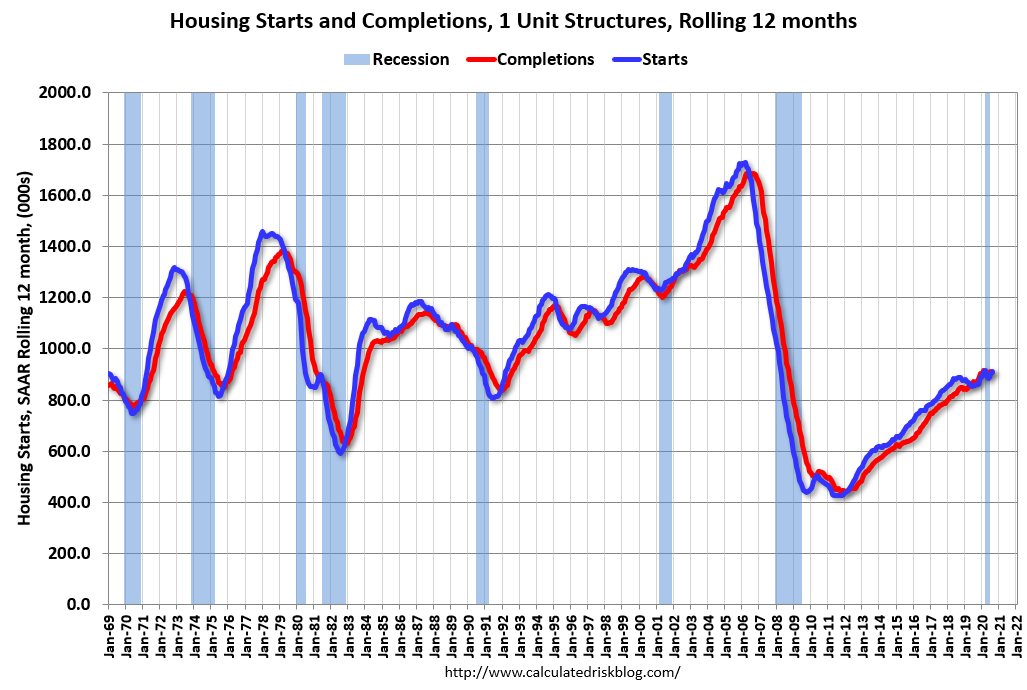 The last graph shows single family starts and completions. It usually only takes about 6 months between starting a single family home and completion – so the lines are much closer. The blue line is for single family starts and the red line is for single family completions.
