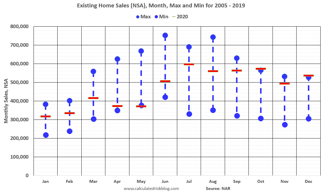 The second graph shows existing home sales Not Seasonally Adjusted (NSA) by month (Red dashes are 2020), and the minimum and maximum for 2005 through 2019.