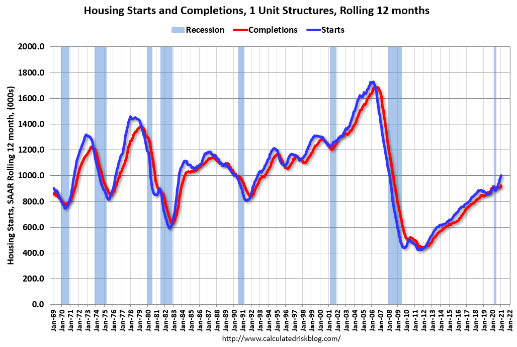 A key point: Housing starts averaged 1.590 million SAAR in the three months prior to the pandemic. That is about the same as January 2021 (although the mix changed to more single family). 2020 was off to a strong start before the pandemic, and with low interest rates and little competing existing home inventory, starts finished the year strong.