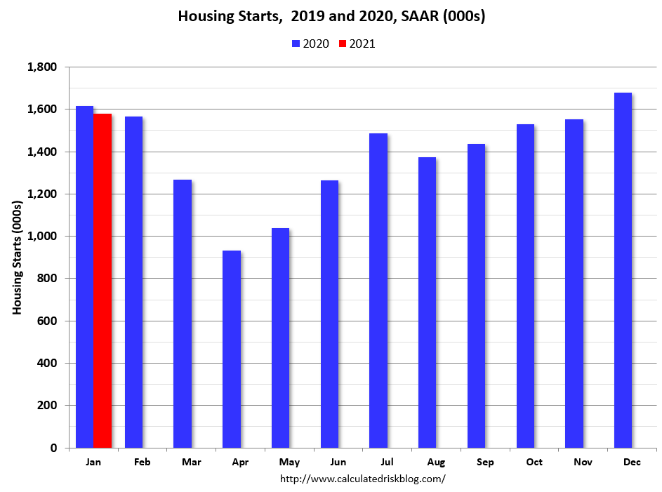 The housing starts report showed starts were down 6.0% in January compared to December, and starts were down 2.3% year-over-year compared to January 2020.