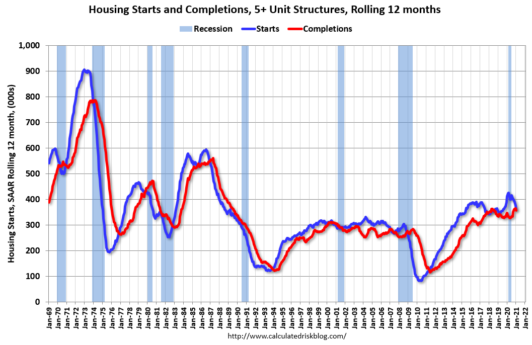 Multifamily Starts and completionsThe blue line is for multifamily starts and the red line is for multifamily completions.