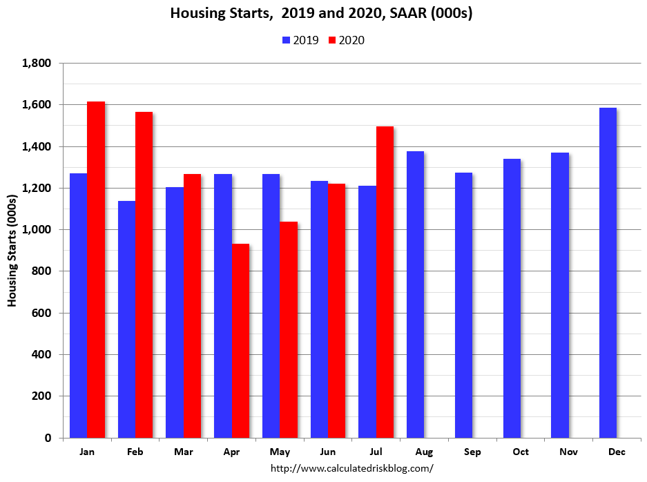 The housing starts report showed starts were up 22.6% in July compared to June, and starts were up 23.4% year-over-year compared to July 2019 (easy comparison).