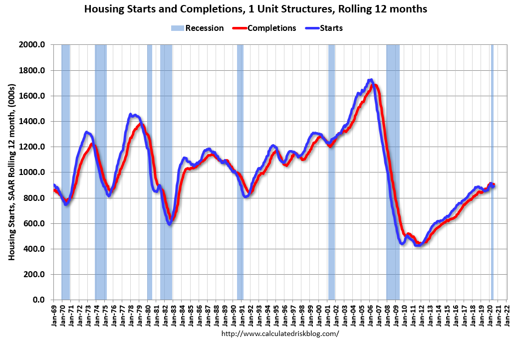 Note the relatively low level of single family starts and completions. The “wide bottom” was what I was forecasting following the recession, and now I expect some further increases in single family starts and completions once the crisis abates.