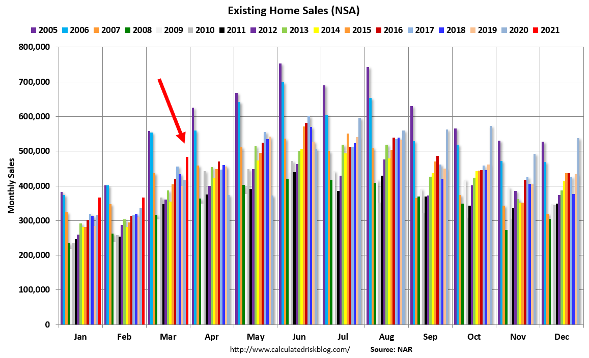 The second graph shows existing home sales for each month, Not Seasonally Adjusted (NSA), since 2005.